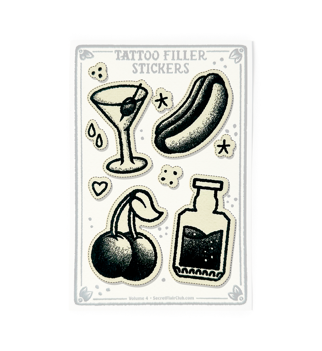 Mini Tattoo Filler stickers! Each sheet is 4" x 6" with a variety of small sizes for a total of 10 little stickers. These are laminated and UV protected so they'll work on virtually any surface from your car windows to your old guitar.